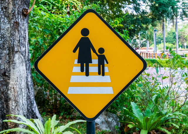 Yellow pedestrian crossing sign featuring mother and child symbol, surrounded by lush greenery and park environment.