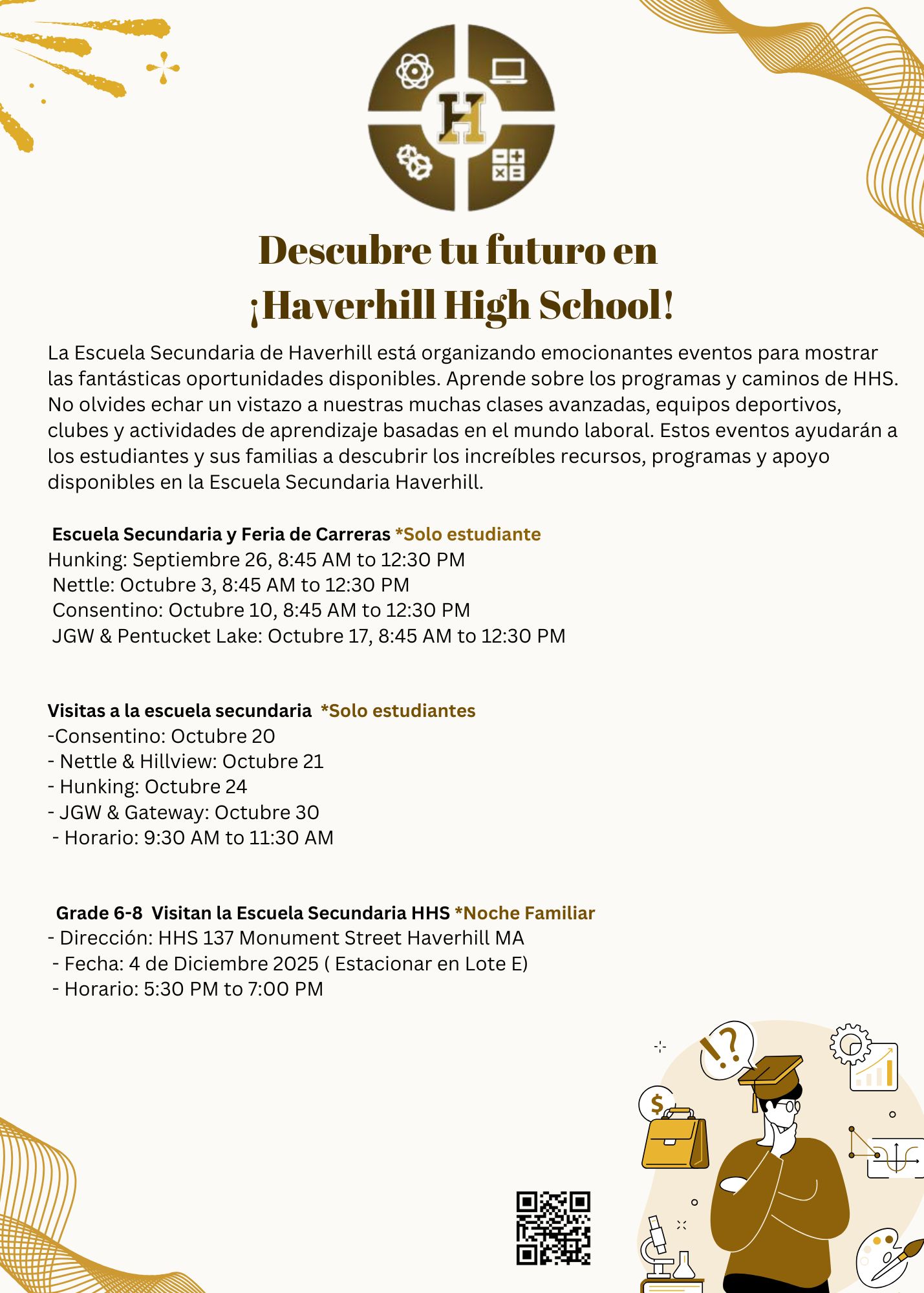 Haverhill High School is hosting exciting events to showcase the fantastic opportunities available. Learn about HHS programs and pathways. Don’t forget to check out our many AP classes, sports teams, clubs and work-based learning activities. These events will help students and families discover the incredible resources, programs, and support available at Haverhill High School.