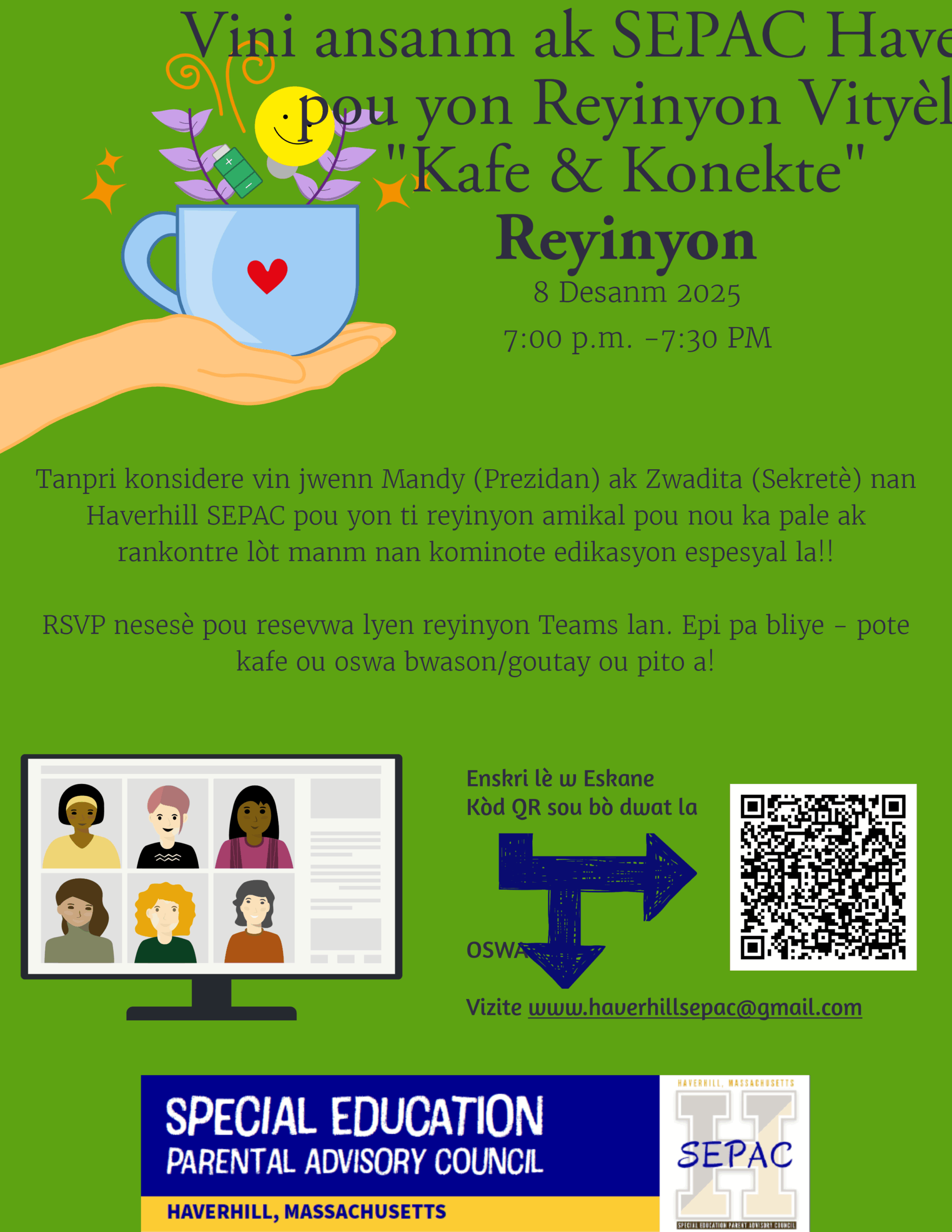 Please consider joining Mandy (Chair) and Zwadita (Secretary) of the Haverhill SEPAC for an informal meeting to simply chat and meet other members in the special education family community!!